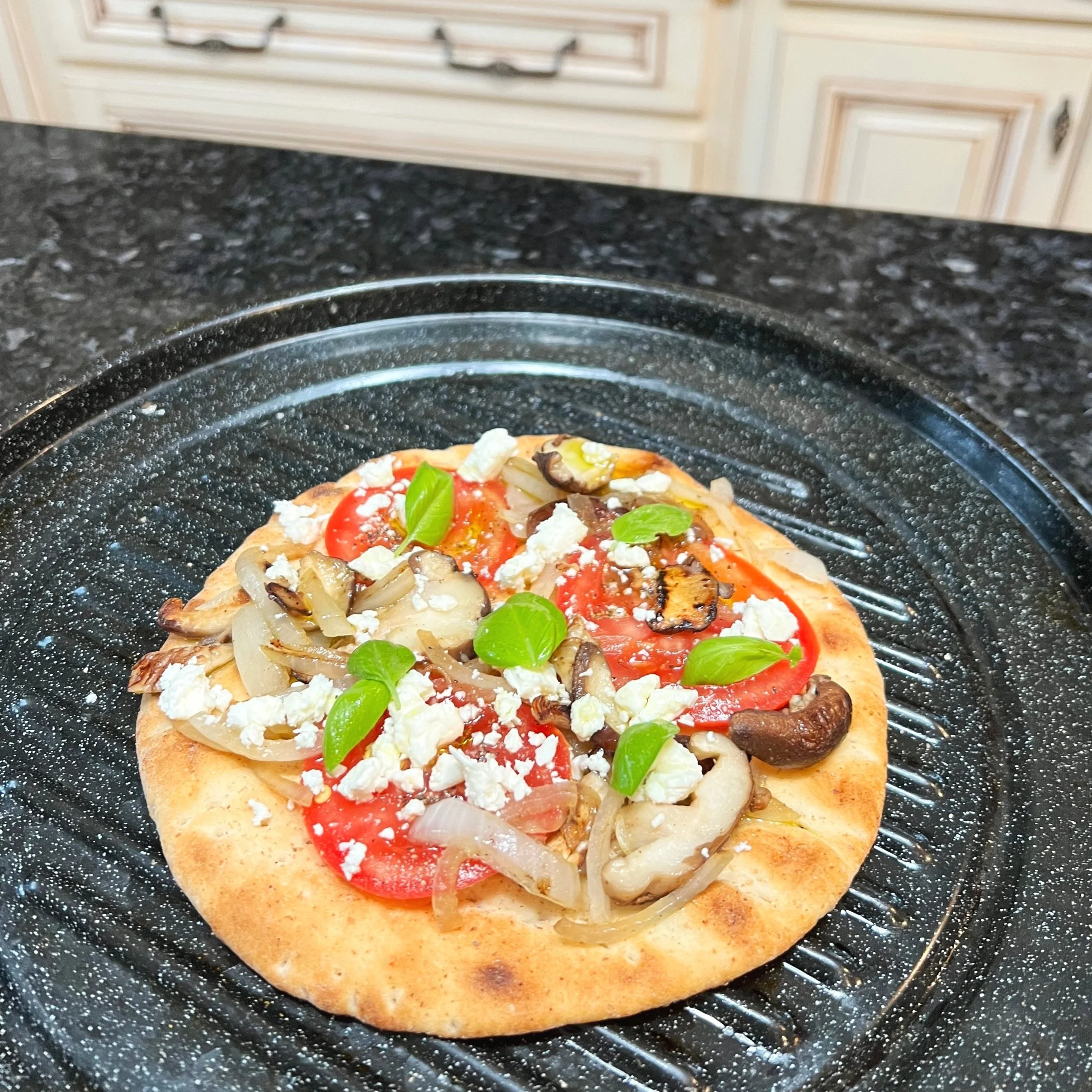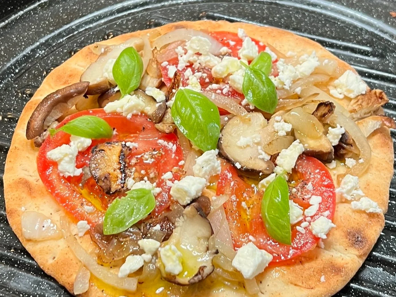 Tomato, Sautéed Onions and Mushrooms, Olive Oil, Salt + Pepper, Feta Cheese and Basil to Finish on a Whole Grain Pita